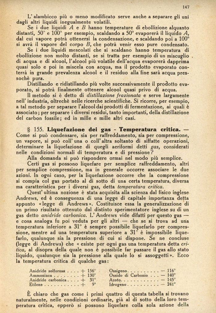 Quest' ultima nozione è stata acquisita alla scienza dal fisico inglese Andrews, ed è conseguenza di una legge di capitale importanza detta appunto « legge di Andrews ». Costituisce essa la generalizzazione di un primo risultato ottenuto dal distinto sperimentatore inglese su di un gas detto anidride carbonica. L' Andrews vide difatti per questo gas — e cosa analoga fu poi veduta per gli altri — che se si trova ad una temperatura inferiore a 31° è sempre possibile liquefarlo per compressione, mentre ad una temperatura superiore a 31° è impossibile liquefarlo, qualunque sia la pressione di cui si dispone. Se ne concluse (legge di Andrews) che « esiste per ogni gas una temperatura detta critica, al disopra della quale non è possibile far passare il gas allo stato liquido, qualunque sia la pressione alla quale lo si assoggetti ». Ecco la temperatura critica di qualche gas: