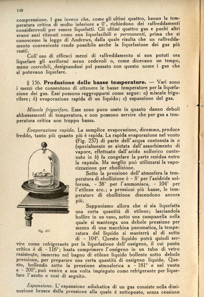 (Fig. 237) di parte dell' acqua contenuta in a (specialmente se aiutata dall' assorbimento di vapore, effettuato dall' acido solforico contenuto in b) fa congelare la parte residua entro la capsula. Ma meglio può utilizzarsi la vaporizzazione per ebollizione.