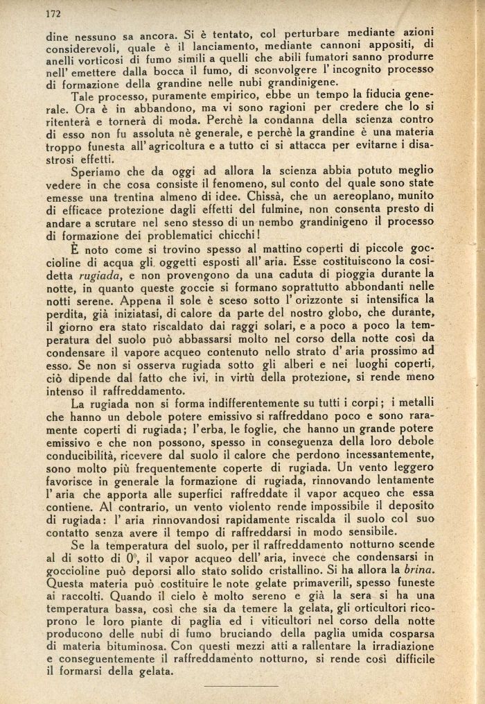 Speriamo che da oggi ad allora la scienza abbia potuto meglio vedere in che cosa consiste il fenomeno, sul conto del quale sono state emesse una trentina almeno di idee. Chissà, che un aereoplano, munito di efficace protezione dagli effetti del fulmine, non consenta presto di andare a scrutare nel seno stesso di un nembo grandinigeno il processo di formazione dei problematici chicchi !