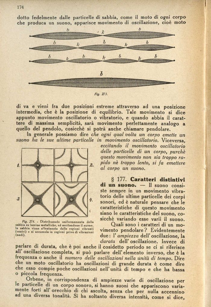 § 177. Caratteri distintivi di un suono. — Il suono consiste sempre in un movimento vibratorio delle ultime particelle dei corpi sonori, ed è naturale pensare che le caratteristiche di questo movimento siano le caratteristiche del suono, cosicché variando esse varii il suono.