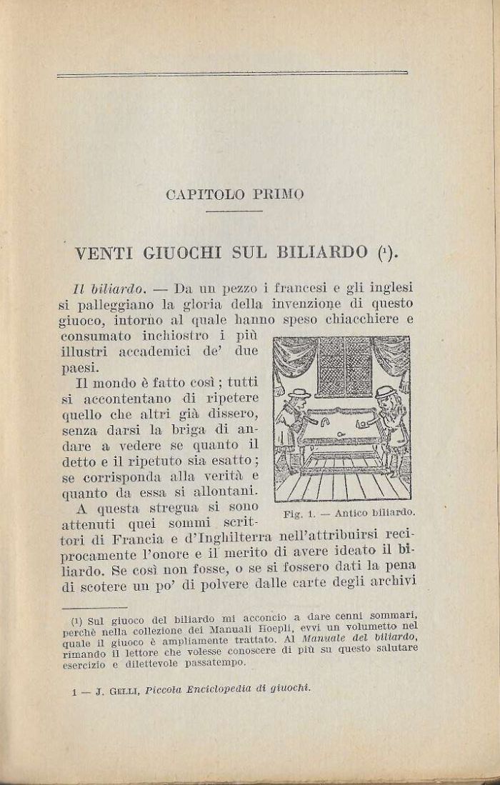 (1) Su) giuoco del biliardo mi acconcio a dare cenni sommari, perchè nella collezione del Manuali Hoepli, evvi un volumetto nel Quale il giuoco e ampliamenti trattato. Al Manuale del biliardo, rimando il lettore che volesse conoscere di pili su questo salutare esercizio e dilettevole passatempo.