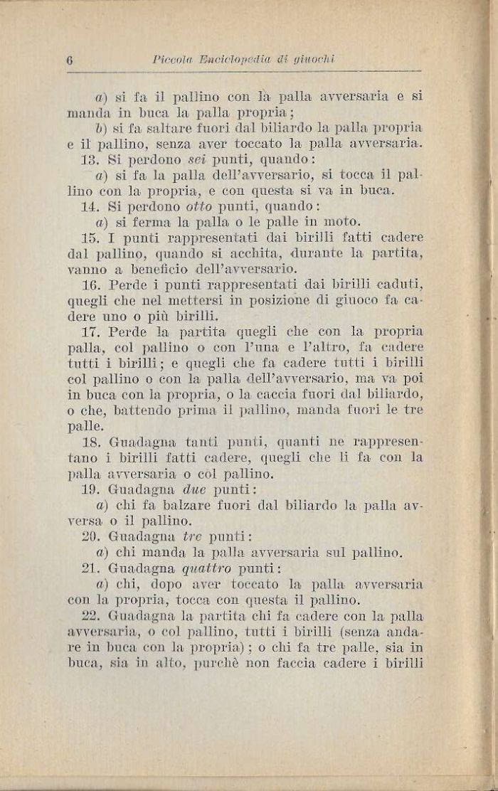 17. Perde la partita quegli che con la propria palla, col pallino o con l'una e l'altro, fa cadere tutti i birilli ; e quegli che fa cadere tutti i birilli col pallino o con la palla dell'avversario, ma va poi in buca con la, propria, o la caccia fuori dal biliardo, o che, battendo prima il pallino, manda fuori le tre palle.