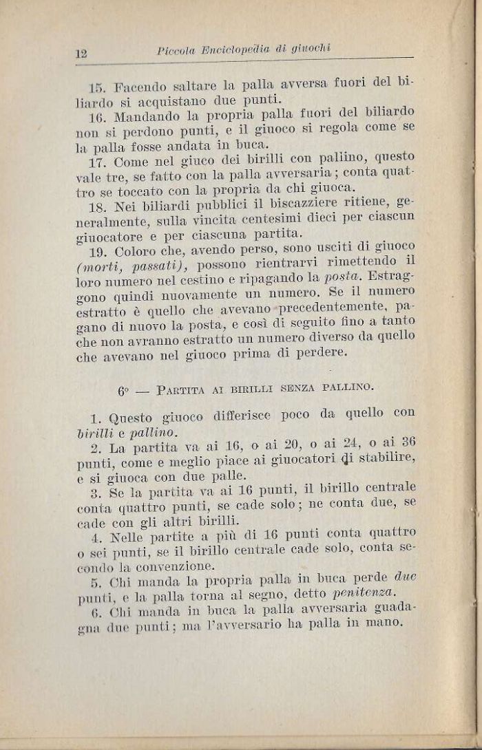 16. Mandando la propria palla fuori del biliardo non si perdono punti, e il giuoco si regola come se la palla fosse andata in buca.