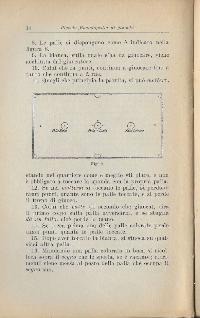 12. Se nel mettersi si toccano le palle, si perdono tanti punti, quante sono le palle toccate, e si perde il turno di giuoco,