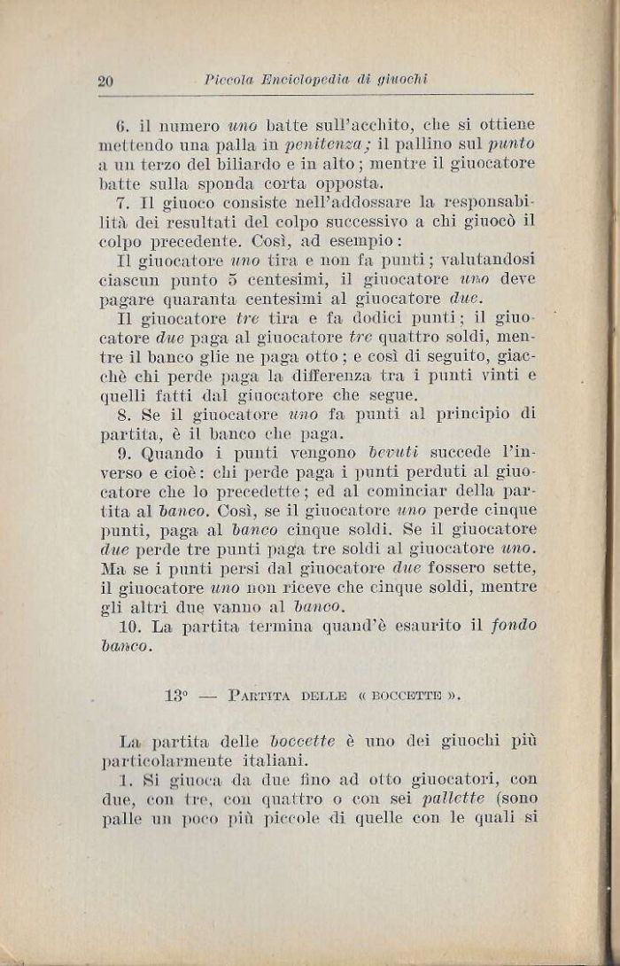 9. Quando i punti vengono bevuti succede l'inverso e cioè : chi perde paga i punti perduti al giuocatore che lo precedette ; ed al cominciar della partita al banco. Così, se il giuocatore uno perde cinque punti, paga al banco cinque solili. Se il giuocatore due perde tre punti paga tre solili al giuocatore uno. Ma se i punti persi dal giuocatore due fossero sette, il giuocatore uno non riceve che cinque soldi, mentre gli altri due vanno al banco.