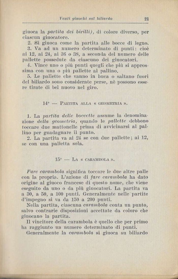 5. Le pallette eli e vanno in buca o saltano fuori del biliardo sono considerate perse, nò possono essere tirate di bel nuovo nel giro.