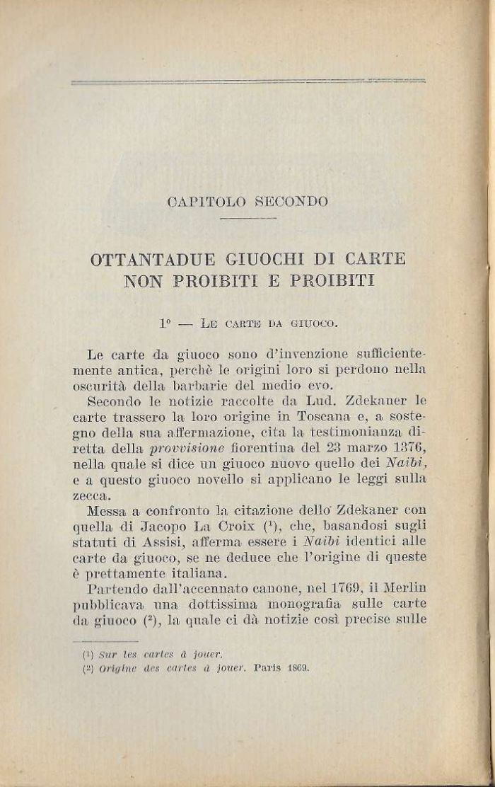Messa a confronto la citazione dello Zdekaner con quella di .Jacopo La Croix ('), che, basandosi sugli statuti di Assisi, afferma essere i No ibi identici alle carte da giuoco, se ne deduce che l'origine di queste è prettamente italiana.