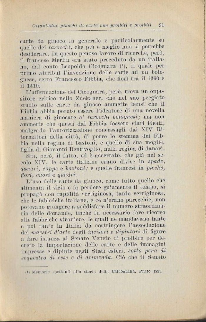carte da giuoco ili generale e particolarmente su quelle dei tarocchi, che più e meglio non si potrebbe desiderare. In questo penoso lavoro di ricerche, però, il francese Merlin era stato preceduto ria un italiano, dal conte Leopoldo Cicognara (1), il quale per primo attribuì l'invenzione delle carte ad un bolognese, certo Francesco Fibbia, che fiorì tra il 1360 e il 1110.