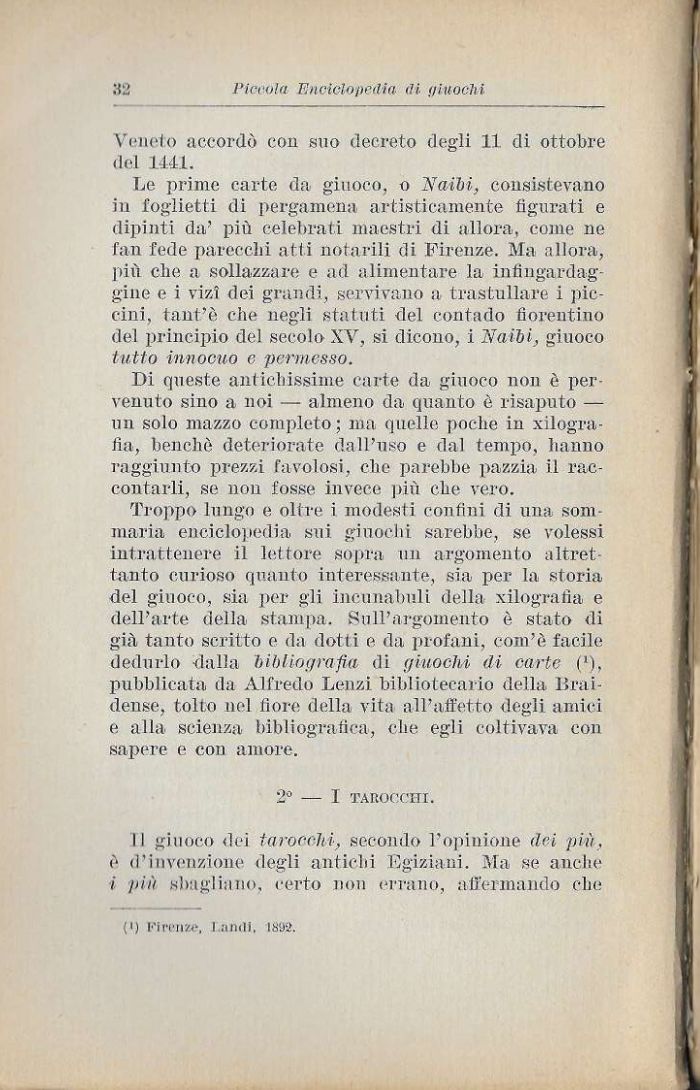 Troppo lungo e oltre i modesti confini di una sommaria enciclopedia sui giuochi sarebbe, se volessi intrattenere il lettore sopra un argomento altrettanto curioso quanto interessante, sia per la storia del giuoco, sia per gii incunabuli della xilografia e dell'arte della stampa. Sull'argomento è stato di già tanto scritto e da dotti e da profani, com'è facile dednrio dalla bibliografia di giuochi di carte (l), pubblicata da Alfredo Lea zi bibliotecario della Brai-dense, tolto nel fiore della vita all'affetto degli amici e alla scienza bibliografica, che egli coltivava con sapere e con amore.