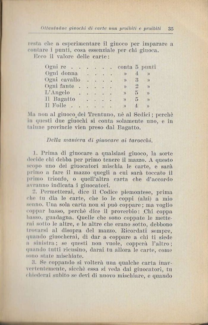 :.'. Permetterai, dice il Codice piemontese, prima 'lie In dia le carte, che io le coppi (alzi) a mio ¦ ¦mio. Una sola carta non si può coppare: ma voglio ' oppar basso, perchè dice il proverbio: Chi coppa i' i: n, guadagna. Quelle che sono coppale le metterai Millo le altre, e le altre che erano sotto, debbono limarsi al disopra del mazzo. Ricordati sempre, quii lido giuocherai, di dar a coppare a chi ti siede i smisi hi, ; se questi non vuole, cepperà l'altro: quando tutti ricusino, darai tu allora le carte, come mio siale mischiate.