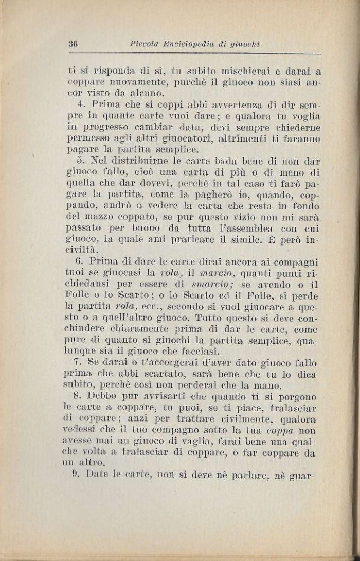 5. Nei distribuirne le carte bada bene di non dar giuoco fallo, cioè una carta di più o di meno di quella che dar dovevi, perchè in tal caso ti farò pagare la partita, come la pagherò io, quando, ceppando, andrò a vedere la carta che resta in fondo del mazzo ceppato, se pur questo vizio non mi sarà passato per buono da tutta l'assemblea con cui giuoco, la quale ami praticare il simile. È però inciviltà.