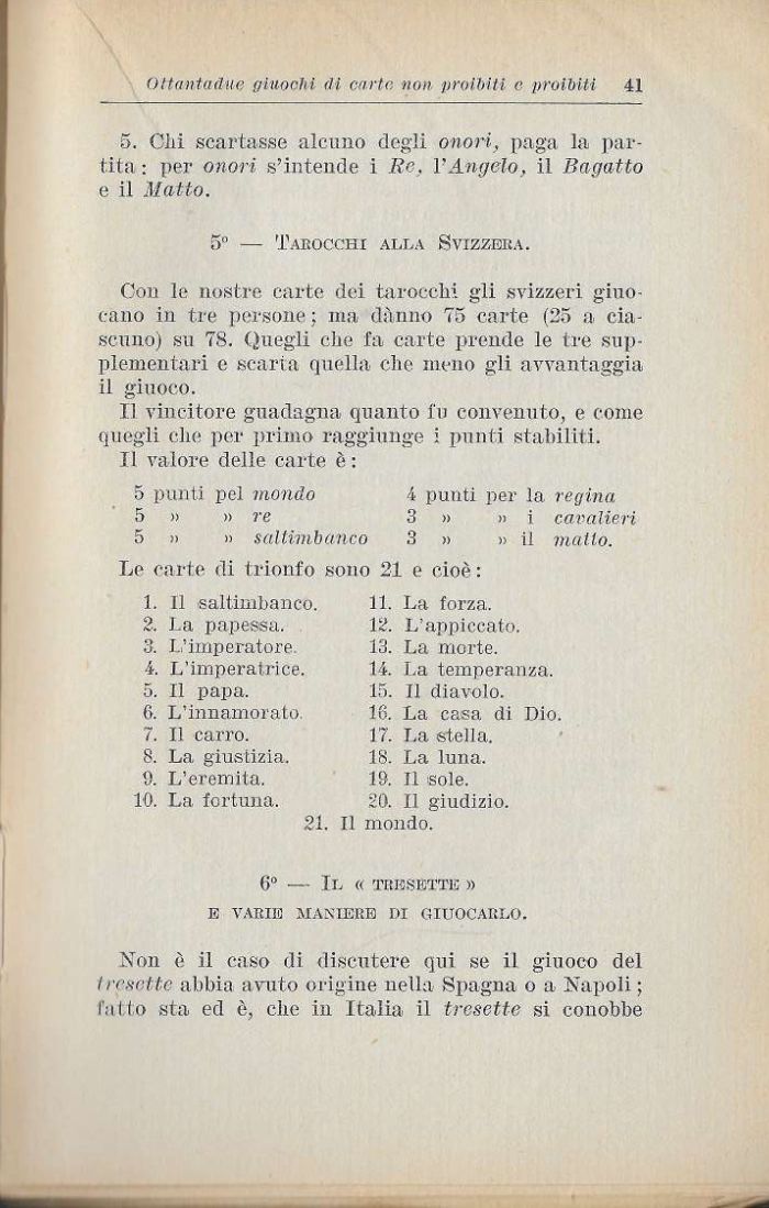 Con le nostre carte dei tarocchi gli svizzeri giuo-eano in tre persone ; ma danno 75 carte (25 a ciascuno) su 78. Quegli che la carte prende le ire supplementari e scarta quella che meno gli avvantaggia il giuoco.