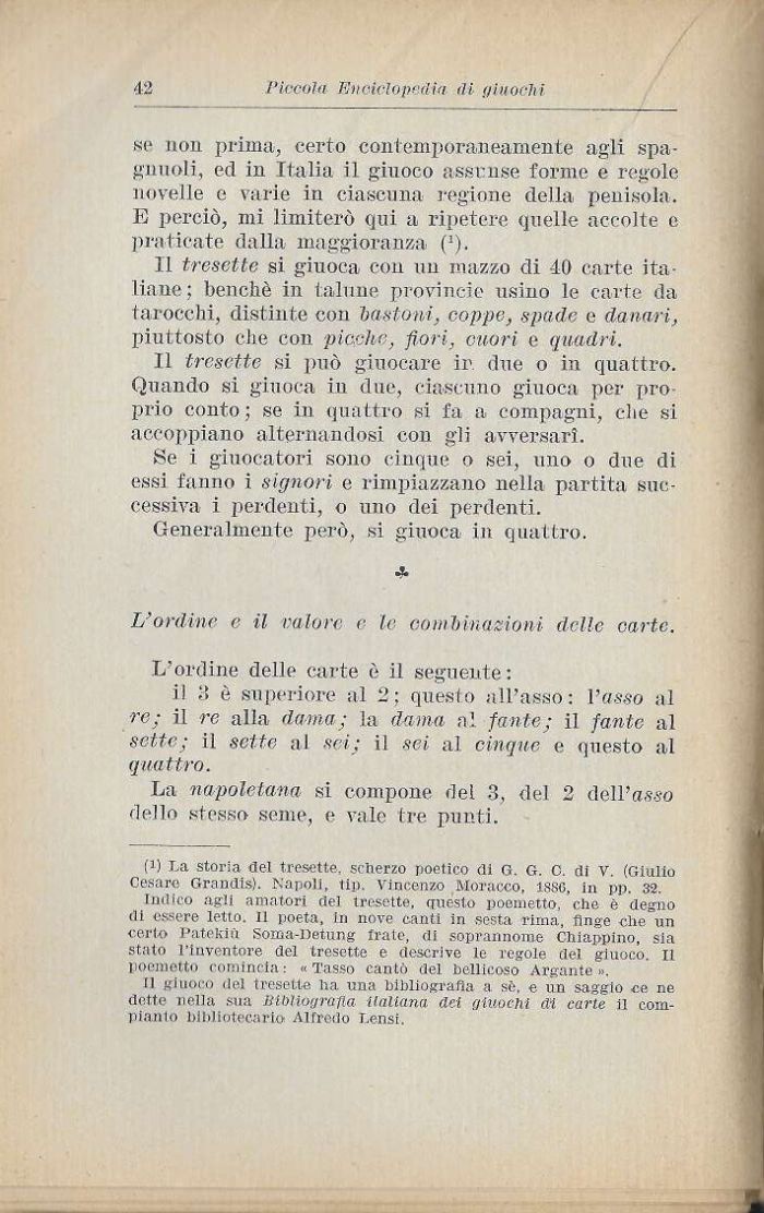 il giuoco del tresette ha una bibliografia a sè, e un saggio ce ne dette nella sua JJlblioyrafla italiana, dei giuochi dì carie il compianto bibliotecario Alfredo Lenst.