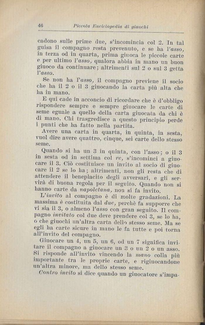 Quando si ha un 3 in quinta, con l'asso ; o il 3 in sesta od in settima col re, s'incominci a giuocare il 3. Ciò costituisce un invito al socio di giuocare il 2 se lo ha; altrimenti, non gli resta che di attendere il beneplacito degli avversari, e gli servirà, di buona regola per il segiìito. Quando non si hanno carte da napoletana, non si fa invito.