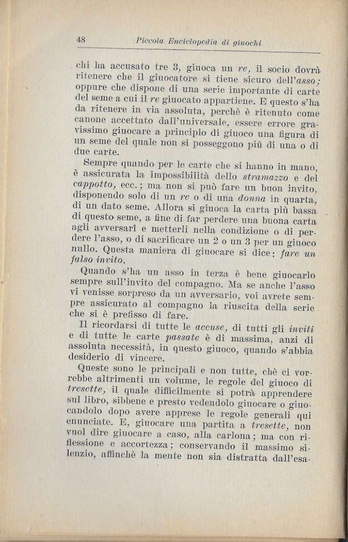 Queste sono le principali e non tutte, cliè ci vorrebbe altrimenti un volume, le regole del giuoco di tresette, il quale difficilmente si potrà apprendere sul libro, sibbene e presto vedendolo giuocare o giuo-candolo dopo avere apprese le regole generali qui enunciate. E, giuocare una partita a tresette, non vuol dire giuocare a caso, alla carlona; ma con riflessione e accortezza; conservando il massimo silenzio, affinchè la mente non sia distratta dall'esa-