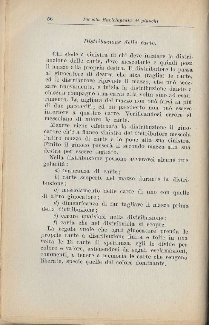 Olii siede a sinistra di chi deve iniziare la distribuzione delle carte, deve mescolarle e quindi posa il mazzo alla propria destra. II. distributore lo passa al giuocatore di destra che alza (taglia) le carte, ed il distributore riprende il mazzo, che può scozzare nuovamente, e inizia la distribuzione dando a ciascun compagno una carta alla volta sino ad esaurimento. La tagliata del mazzo non può farsi in più di due pacchetti ; ed un pacchetto non può essere inferiore a quattro carte. Verificandosi errore si mescolano di nuovo le carte.