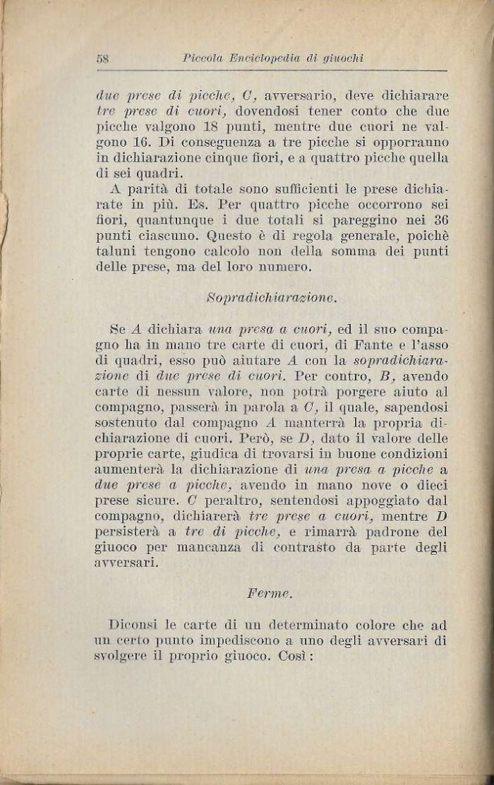 Se A dichiara una presa a cuori, ed il suo compagno ha in mano tre carte di cuori, di Fante e Passo di quadri, esso può aiutare A con la sopradichiara,-sionc di due prese di cuori. Per contro, B, avendo carte di nessun valore, non potrà porgere aiuto al compagno, passerà in parola a C, il quale, sapendosi sostenuto dal compagno A manterrà la propria, dichiarazione di cuori. Però, se D, dato il valore delle proprie carte, giudica di trovarsi in buone condizioni aumenterà la dichiarazione di una presa, a picche a due prese a picche, avendo in mano nove o dieci prese sicure. (J peraltro, sentendosi appoggiato dal compagno, dichiarerà tre prese a cuori, mentre D persisterà a tre dì picche, e rimarrà padrone del giuoco per mancanza di contrasto da parte degli avversari.