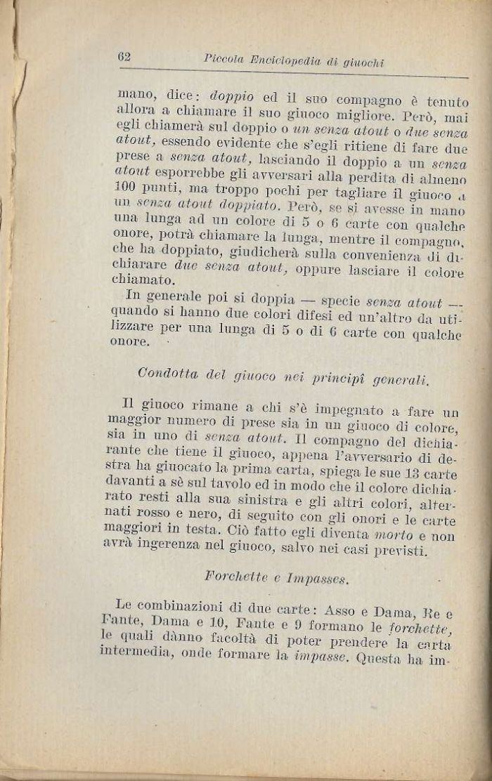 mano, dice : doppio ed il suo compagno è tenuto allora a chiamare il suo giuoco migliore. Però, mai egli chiamerà sul doppio o un senza atout o due senza atout, essendo evidente che s'egli ritiene di fare due prese a senza atout, lasciando il doppio a un senza atout esporrebbe gli avversari alla perdita di almeno 100 punti, ma troppo pochi per tagliare il giuoco ,i un senza atout doppiato. Però, se si avesse in mano una lunga ad uri colore di 5 o G carte con qualche onore, potrà chiamare la lunga, mentre il compagno, che ha doppiato, giudicherà sulla convenienza di dichiarare due senza atout, oppure lasciare il colore chiamato.