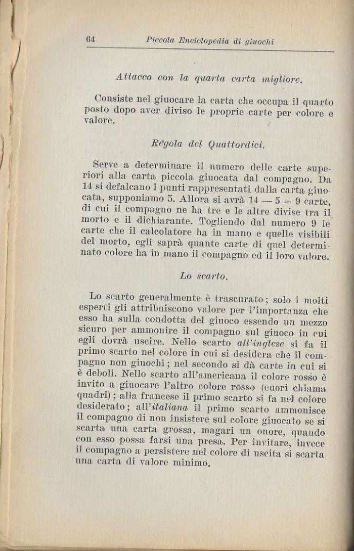 Lo scarto generalmente è trascurato ; solo i molti esperti gli attribuiscono valore per l'importanza che esso ha sulla condotta del giuoco essendo un mezzo sicuro per ammonire il compagno sul giuoco in cui egli dovrà uscire. Kello scarto all'inglese si fa il primo scarto nel colore in cui si desidera che il compagno non giuochi ; nel secondo si dà carte in cui si è deboli. 3STello scarto all'americana il colore rosso è invito a giuocare l'altro colore rosso (cuori chiama quadri) ; alla francese il primo scarto si fa nel colore desiderato ; a\Vitaliana- il primo scarto ammonisce il compagno di non insistere sul colore giuoca to se si scarta una carta grossa, magari un onore, quando con esso possa farsi una presa. Per invitare, invece il compagno a persistere nel colore di uscita si scarta una carta ili valore minimo.