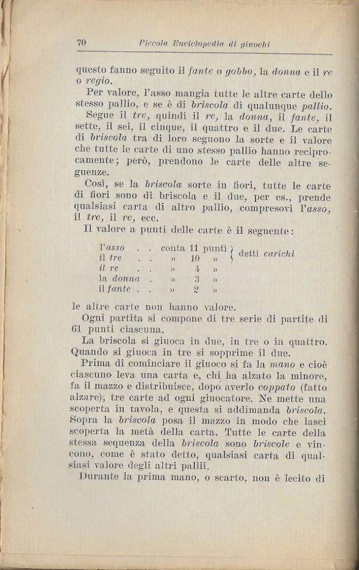Segue il tre, quindi il re, la. donna, il fante, il sette, il sei, il cinque, il quattro e il due. Le carte di briscola tra di loro seguono la. sorte e il valore che tutte le carte di uno stesso pallio hanno reciprocamente; però, prendono le carte delle altre se-guenze.