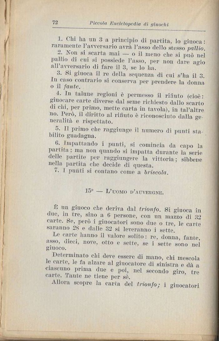 È un giuoco che deriva dal trionfo. Si giuoca in due, in tre, sino a 6 persone, con un mazzo di 32 carte. Se, però i giuocatori sono due o tre, le carte saranno 28 e dalle 32 si leveranno i sette.