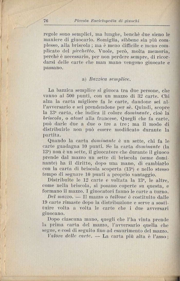 l'ego le Mono semplici, imi lunghe, benché due sieno le maniere di giuocarlo. Somiglia, sibbene sia più complesso, alla briscola ; ma è meno difficile e meno complicato del picchetto. Vuole, però, molta memoria, perchè è necessario, per non perdere sempre, di ricordarsi delle carte che man mano vengono giuncate e passano.