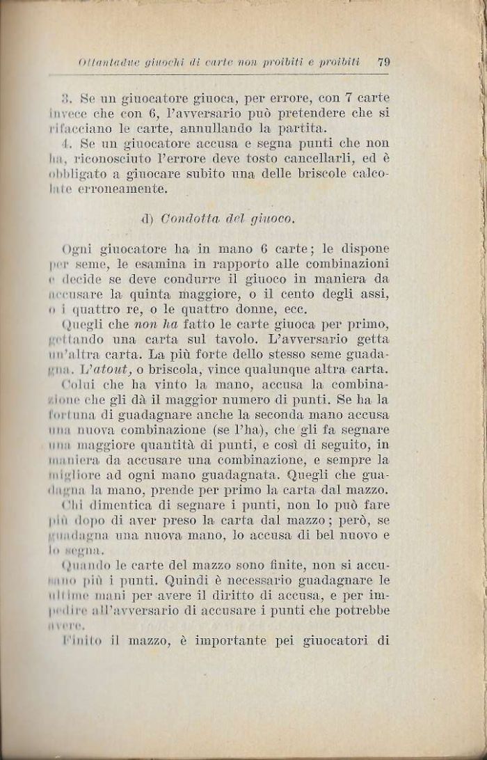 Quegli che non ha fatto le carte giuoca per primo, i-i Lindo una carta sul tavolo. L'avversario getta un'altra carta. La più forte dello stesso seme guada-Mi'. \l'atout, o briscola, vince qualunque altra carta.