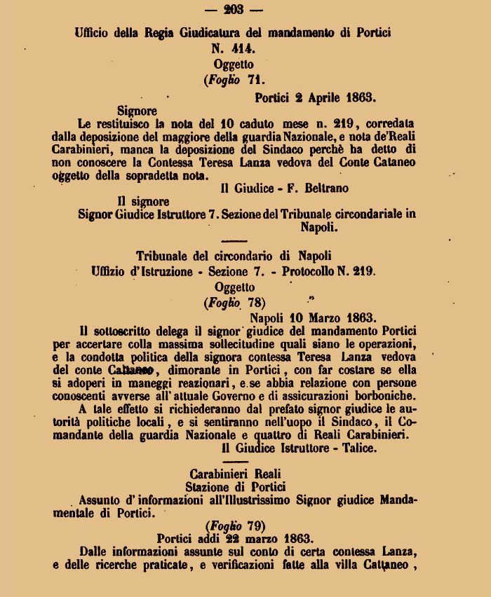 (Foglio 79) Portici addi 22 marzo 1863. Dalle informazioni assunte sul conto di certa contessa Lanza, e delle ricerche praticate, e verificazioni fatte alla villa Carneo ,