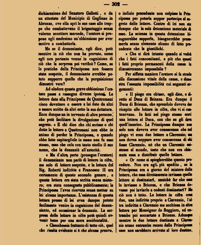 « Ma d'altra parte (prosegue l'oratore) il denunziante non parlò di lettere in cifra, ma solo di lettere sospette, e la lettera del Sig. Roberti indiritta a Francesco li era certamente di questo secondo genere, e questa lettera era stata scritta senza mistero; era stata consegnata pubblicamante; la Principessa l'avea ricevuta senza metter su lei alcuna importanza. L'esistenza di questa lettera presso di lei avea dunque potuto facilmente venire in cognizione del denunziente, ed occasionar la denunzia. La sorpresa delle lettere in cifra potè quindi avvenir bene per una mera accidentalità.