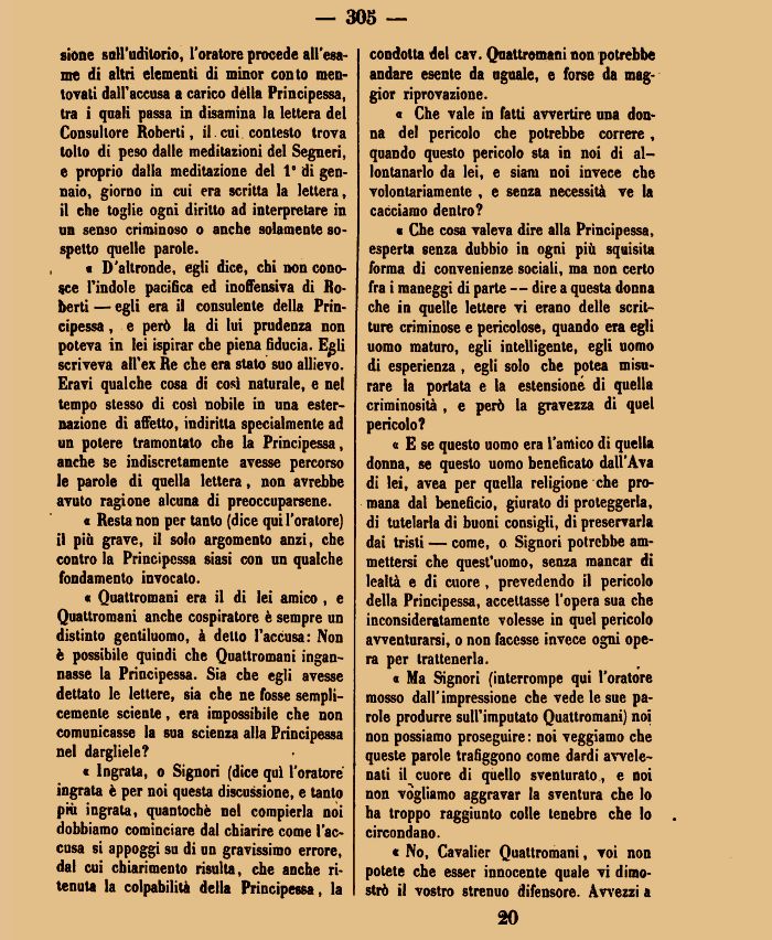« Quattromani era il di lei amico , e Quattromani anche cospiratore è sempre un distinto gentiluomo, à detto l'accusa: Non è possibile quindi che Quattromani ingannasse la Principessa. Sia che egli avesse dettato le lettere, sia che ne fosse semplicemente sciente, era impossibile che non comunicasse la sua scienza alla Principessa nel dargliele?