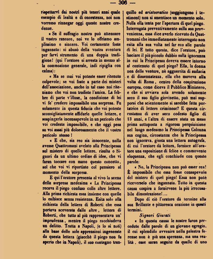 quillo ed aristocratico (soggiungono i testimoni) non si smentisce un momento solo. Nulla ella tenta per l'apertura di quel piego. Interrogata preventivamente sulla sua prov-venienza, essa dice averlo ricevuto da Quattromani che immediatamente interrogato non esita alla sua volta nel far eco alle parole di lei. E tutto questo, dice l'oratore, può lasciare il più piccolo dubbio sulla ignoranza in cui la Principessa doveva essere intorno al contenuto di quel piego? Ella, la donna non delle venture, nè agguerrita di audacia e di dissennatezza, ella che moveva alla volta di Roma, centro della cospirazione europea, come diceva il Pubblico Ministero, e che si avviava sola avendo solamente seco il suo figlio giovinetto, può mai supponi che scientemente si sarebbe fatta portatrice di lettere criminose? E questa circostanza di aver seco codesto figlio di 13 anni, e l'altra di essere stata un mese prima sottoposta a rigorosa perquisizione nel luogo medesimo la Principessa Colouna sua cugina, circostanza che la Principessa non ignorava, giusta una lettera autografa, di cui l'oratore dà lettura, fornisce all'oratore una esposizione di felice e commovente eloquenza, che egli conchiude con queste parole: