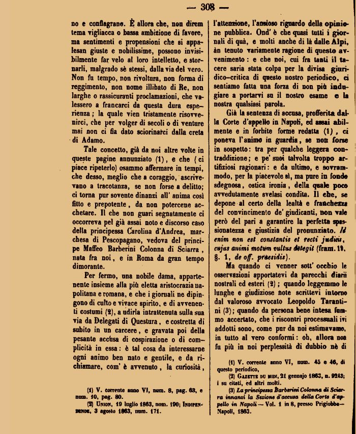 (3) La principessa Éarberini Colonna di Sciarra innansi lo Seziona d'accuta della Corte d'appello in Napoli — Voi. 1 in 8, presso Prigiobbe-Napoli, 1863.