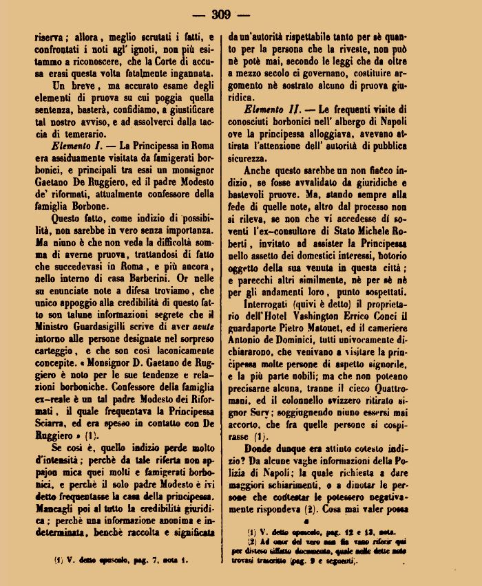 Elemento /. — La Principessa in Roma era assiduamente visitata da famigerati borbonici, e principali tra essi un monsignor Gaetano De Ruggiero, ed il padre Modesto de' riformati, attualmente confessore della famiglia Borbone.