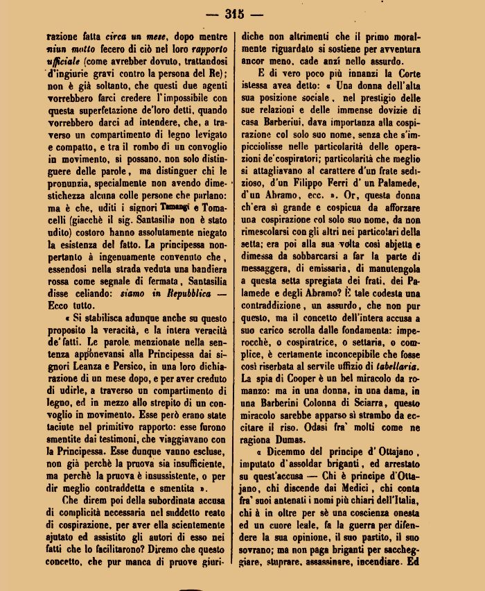 E di vero poco più innanzi la Corte istessa avea detto: « Una donna dell'alta sua posizione sociale, nel prestigio delle sue relazioni e delle immense dovizie di casa Barberiui, dava importanza alla cospirazione col solo suo nome, senza che s'impicciolisse nelle particolarità delle operazioni de'cospiratori; particolarità che meglio si attagliavano al carattere d'un frate sedizioso, d'un Filippo Ferri d' un Palamede, d'un Abramo, ecc. ». Or, questa donna ch'era sì grande e cospicua da afforzare una cospirazione col solo suo nome, da non rimescolarsi con gli altri nei particolari della setta; era poi alla sua volta così abjetta e dimessa da sobbarcarsi a far la parte di messaggera, di emissaria, di manutengola a questa setta spregiata dei frati, dei Palamede e degli Abramo? E tale codesta una contraddizione, un assurdo, che non pur questo, ma il concetto dell'intera accusa a suo carico scrolla dalle fondamenta: imperocché, o cospiratrice, o settaria, o complice, è certamente inconcepibile che fosse così riserbata al servile uffizio di tabellaria. La spia di Cooper è un bel miracolo da romanzo: ma in una donna, in una dama, in una Barberini Colonna di Sciarra, questo miracolo sarebbe apparso sì strambo da eccitare il riso. Odasi fra' molti come ne ragiona Dumas.