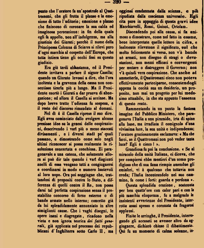 Nel di 4 il Casella riprese il suo dire. Egli avea cominciato dallo svolgere alcune preziose idee su la genesi delle cospirazioni, descrivendo i vari più o meno staccati divisamenti , e i diversi stadi pe' quali passano, e dimostrando come solo negli ultimi riconoscer si possa realmente la risoluzione concertata e conchiusa. Ei paragonavate a una catena, che solamente allora si può dir tale quando i vari disgiunti anelli di essa vengano tutti a congiugnersi e coordinarsi in modo e numero baslevoli al loro uopo. Ora poi soggiugne che, trattandosi di propositi contra Io Stato, a differenza di quelli contra il Re, non possa darsi tal perfetta cospirazione senza il prestabilito concorso di forze esterne o di bande armate nello interno; concetto già da lui splendidamente annunziato in altre simiglianti cause. Che i vaghi disegni, le opere inani e disgregate, ricadono nella vieta e non ignota teorica dei fatti generali, già applicata nel processo dei repubblicani d'Inghilterra sotto Carlo II, ma