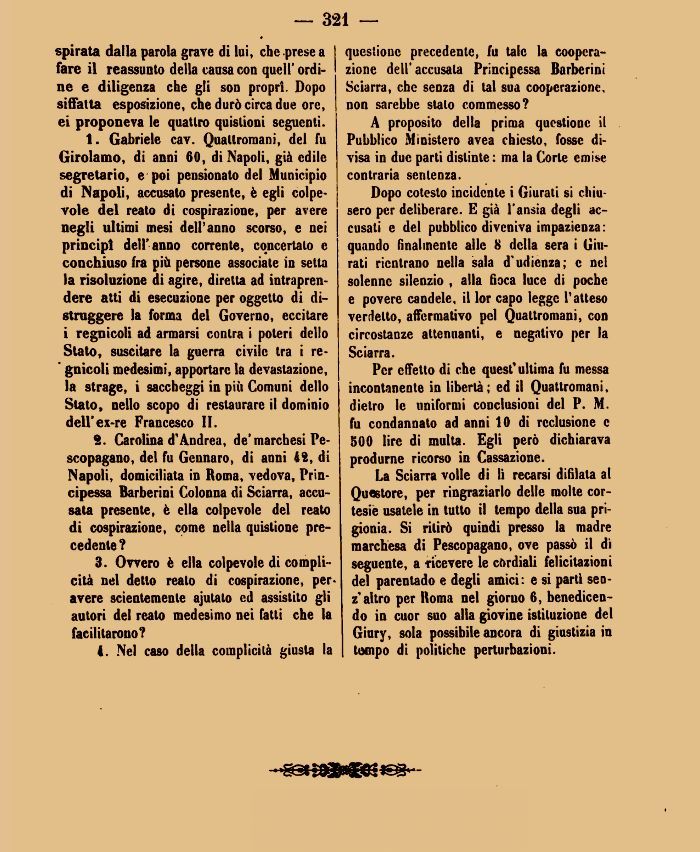 La Sciarra volle di lì recarsi difilala al Questore, per ringraziarlo delle molte cortesie usatele in tutto il tempo della sua prigionia. Si ritirò quindi presso la madre marchesa di Pescopagano, ove passò il dì seguente, a ricevere le cordiali felicitazioni del parentado e degli amici: e si partì senz'altro per Roma nel giorno 6, benedicendo in cuor suo alla giovine istituzione del Giury, sola possibile ancora di giustizia in tempo di politiche perturbazioni.