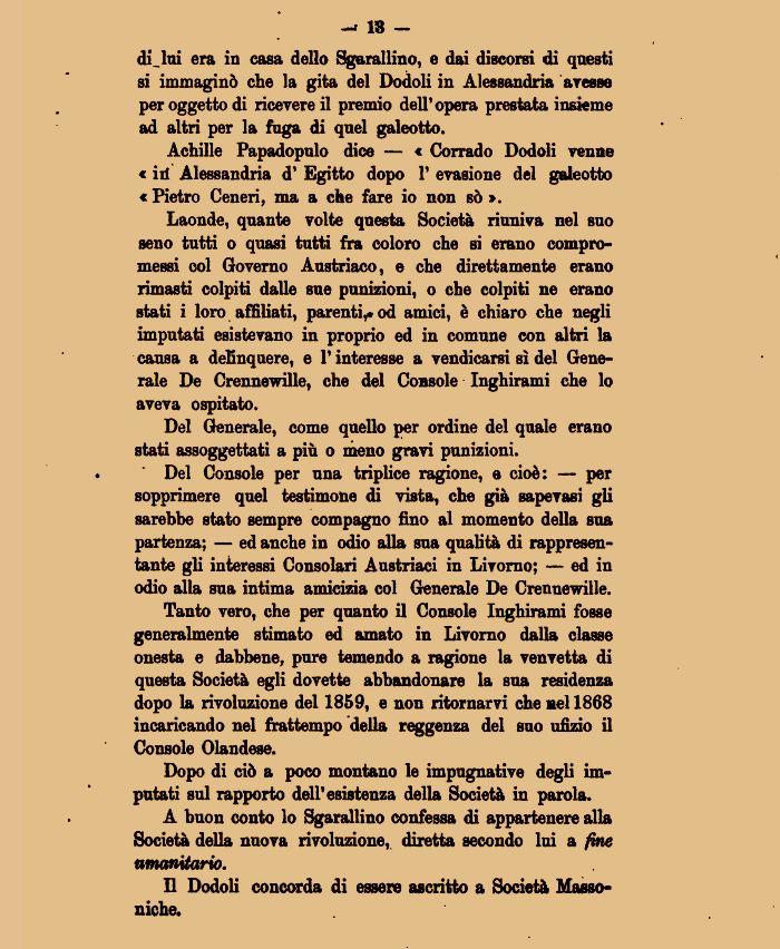 Achille Papadopulo dice — « Corrado Dodoli venne « iil Alessandria d1 Egitto dopo 1' evasione del galeotto « Pietro Ceneri, ma a che fare io non sò ».