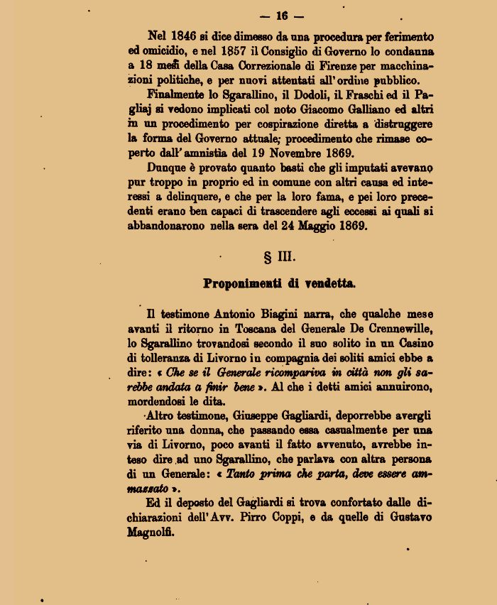 Altro testimone, Giuseppe Gagliardi, deporrebbe avergli riferito una donna, che passando essa casualmente per ana via di Livorno, poco avanti il fatto avvenuto, avrebbe inteso dire ad uno Sgarallino, che parlava con altra persona di un Generale: « Tanto prima che parta, deve essere ammazzato ».