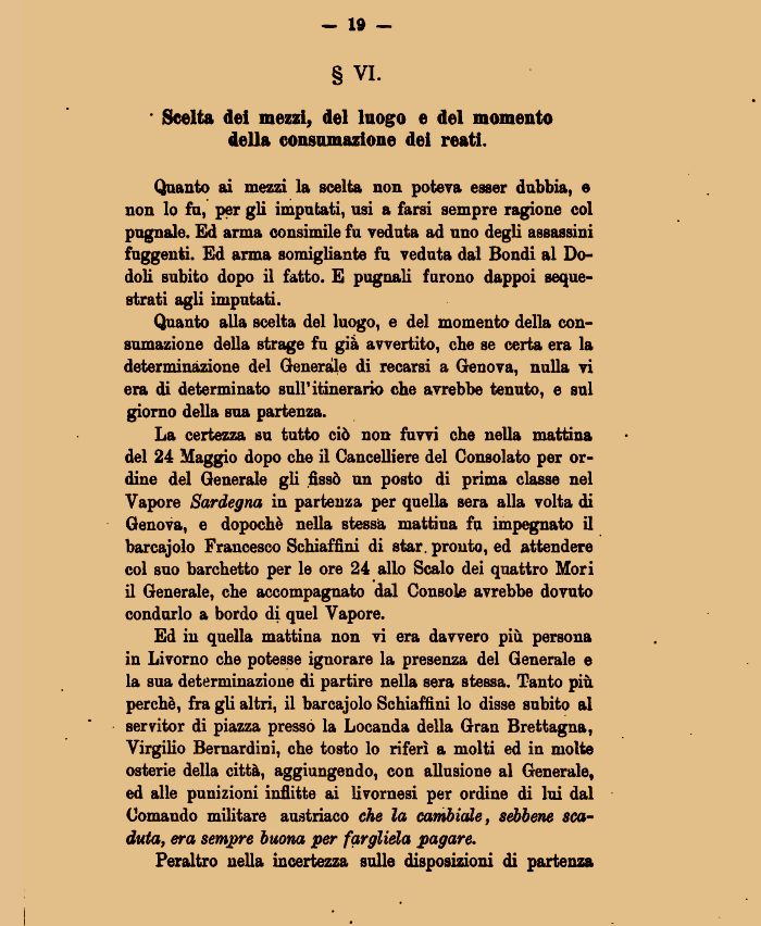 La certezza su tutto ciò non fuwi che nella mattina del 24 Maggio dopo che il Cancelliere del Consolato per ordine del Generale gli fissò un posto di prima classe nel Vapore Sardegna in partenza per quella sera alla volta di Genova, e dopoché nella stessa mattina fu impegnato il barcajolo Francesco Schiaffini di star, pronto, ed attendere col suo barchetto per le ore 24 allo Scalo dei quattro Mori il Generale, che accompagnato dal Console avrebbe dovuto condurlo a bordo di quel Vapore.