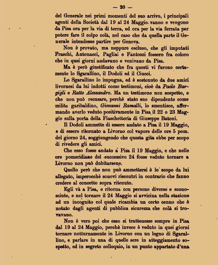 Non è vero poi che esso si trattenesse sempre in Pisa dal 19 al 24 Maggio, perchè invece è veduto in quei giorni tornare notturnamente in Livorno con un legno di Sgarallino, e parlare in una di quelle sere in atteggiamento sospetto, ed in segreto colloquio, in un punto appartato d'una