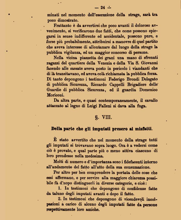 Frattanto è da avvertirsi che poco avanti il doloroso avvenimento, si verificarono due fatti, che come possono spiegarsi in senso indifferente ed accidentale, possono pure, e forse più probabilmente, attribuirsi a manovre di quel partito che aveva interesse di allontanare dal luogo della strage la pubblica vigilanza, ed un maggior concorso di persone.