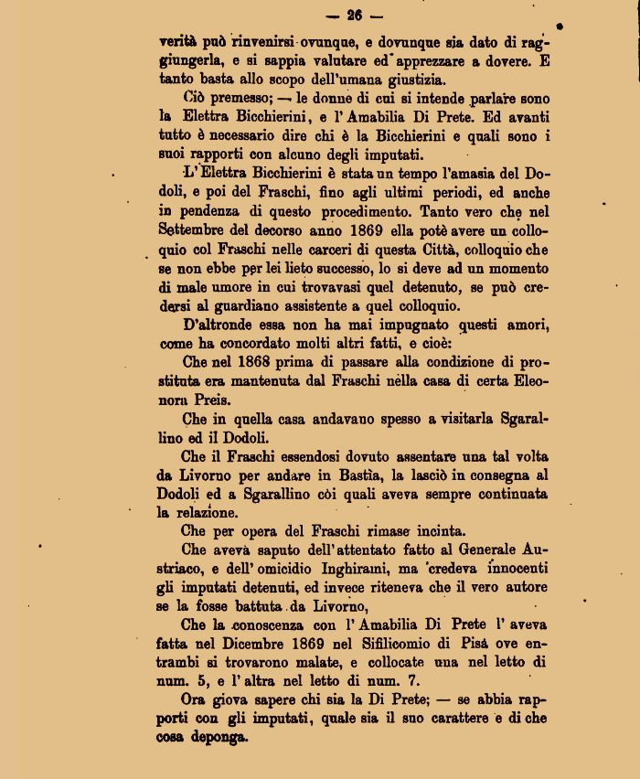 L'Elettra Bicchierini è stata un tempo l'amasia del Dodoli, e poi del Fraschi, fino agli ultimi periodi, ed anche in pendenza di questo procedimento. Tanto vero che nel Settembre del decorso anno 1869 ella potè avere un colloquio col Fraschi nelle carceri di questa Città, colloquio che se non ebbe ppr lei lieto successo, lo si deve ad un momento di male umore in cui trovavasi quel detenuto, se può credersi al guardiano assistente a quel colloquio.