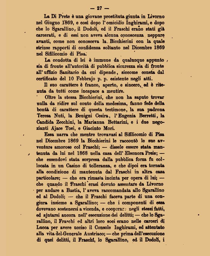 Essa narra che mentre trovavasi al Sifilicomio di Pisa nel Dicembre 1869 la Bicchierini le raccontò le sue avventure amorose col Fraschi; — dissele essere stata man-j tenuta da lui nel 1868 nella casa dell' Eleonora Preis; — che essendovi stata sorpresa dalla pubblica forza fu collocata in un Casino di tolleranza, e che dipoi era tornata alla condizione di mantenuta dal Fraschi in altra casa particolare; — che era rimasla incinta per opera di lui; — che quando il Fraschi erasi dovuto assentare da Livorno per andare a Bastia, 1' aveva raccomandata allo Sgarallino ed al Dodoli; — che il Fraschi faceva parte di una congiura insieme a Sgarallino; — che i componenti di essa dovevano sostenersi a vicenda, e coopsrar : negli stessi fatti, ed ajutarsi ancora nell' esecuzione dei delitti; — che lo Sgarallino, il Fraschi ed altri loro soci erano nelle carceri di Lucca per avere ucciso il Console Inghirami, ed attentato alla vita del.Generale Austriaco; — che prima dell'esecuzione di quei delitti, il Fraschi, lo Sgarallino, ed il Dodoli, i