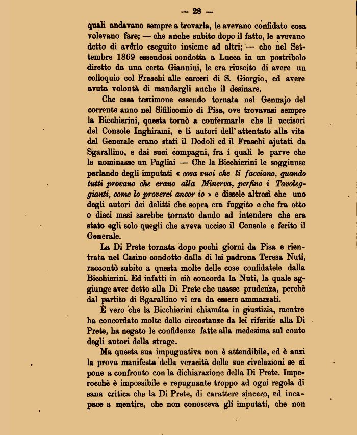 Che essa testimone essendo tornata nel Gennajo del corrente anno nel Sifilicomio di Pisa, ove trovavasi sempre la Bicchierini, questa tornò a confermarle che li uccisori del Console Inghirami, e li autori dell' attentato alla vita del Generale erano stati il Dodoli ed il Fraschi ajutati da Sgarallino, e dai suoi compagni, fra i quali le parve che le nominasse un Pagliai — Che la Bicchierini le soggiunse parlando degli imputati « cosa vuoi che li facciano, quando tutti provano che erano alla Minerva, perfino i Tavoleggianti, come lo prove/rei ancor io » e dissele altresì che uno degli autori dei delitti Che sopra era fuggito e che fra otto o dieci mesi sarebbe tornato dando ad intendere che era stato egli solo quegli che aveva ucciso il Console e ferito il Generale.