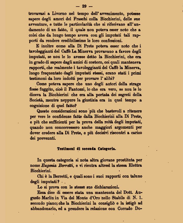 trovatisi a Livorno nel tempo dell' avvenimento, potesse sapere degli amori del Frasclii colla Bicchierini, delle sue avventure, e tutte le particolarità che si riferivano all'andamento di un fatto, il quale non poteva esser noto che a colei che da lungo tempo aveva con gli imputati tali rapporti da rendere credibilissime le loro confessioni.