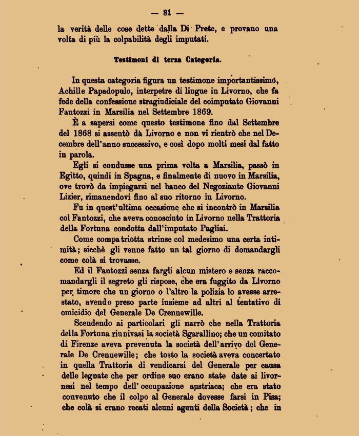 In questa categoria figura un testimone importantissimi, Achille Papadopulo, interpetre di lingue in Livorno, che fa fede della confessione stragiudiciale del coimputato Giovanni Fantozzi in Marsilia nel Settembre 1869.