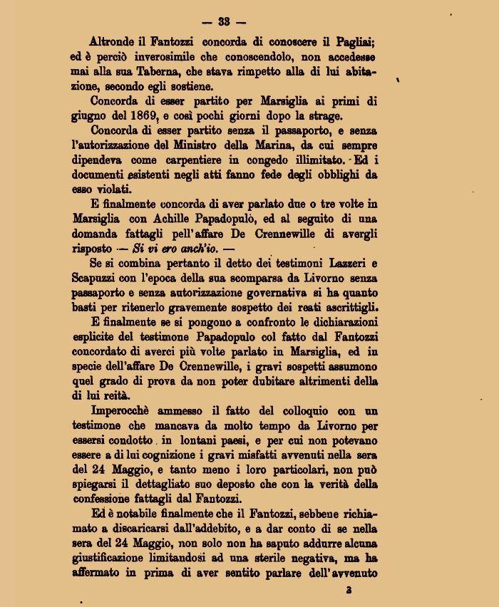 Se si combina pertanto il detto dei testimoni Lazzeri e Scapuzzi con l'epoca della sua scomparsa da Livorno senza passaporto e senza autorizzazione governativa si ha quanto basti per ritenerlo gravemente sospetto dei reati ascrittigli.