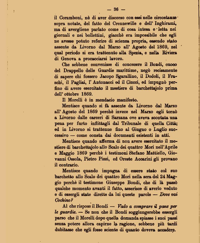 Al che rispose il Bondi — Vado a comprare il pane per le guardie. — Se non che il Bondi soggiungerebbe essergli parso che il Morelli dopo quella domanda spiasse i suoi passi senza potere allora capirne lp, ragione, sebbene più tardi dubitasse che egli fosse sciente di quanto doveva accadere.
