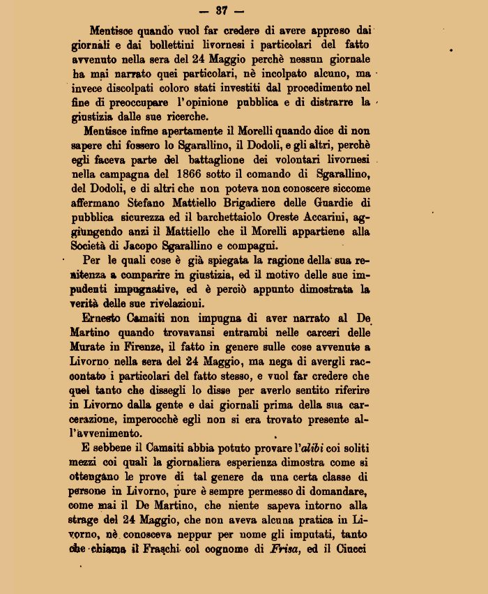 E sebbene il Camaiti abbia potuto provare Vedili coi soliti mezzi coi quali la giornaliera esperienza dimostra come si ottengano le prove di tal genere da una certa classe di persone in Livorno, pure è sempre permesso di domandare, come mai il De Martino, che niente sapeva intorno alla strage del 24 Maggio, che non aveva alcuna pratica in Livorno, né conosceva neppur per nome gli imputati, tanto che -chiama il Fraschi col cognome di Frisa, ed il Ciucci