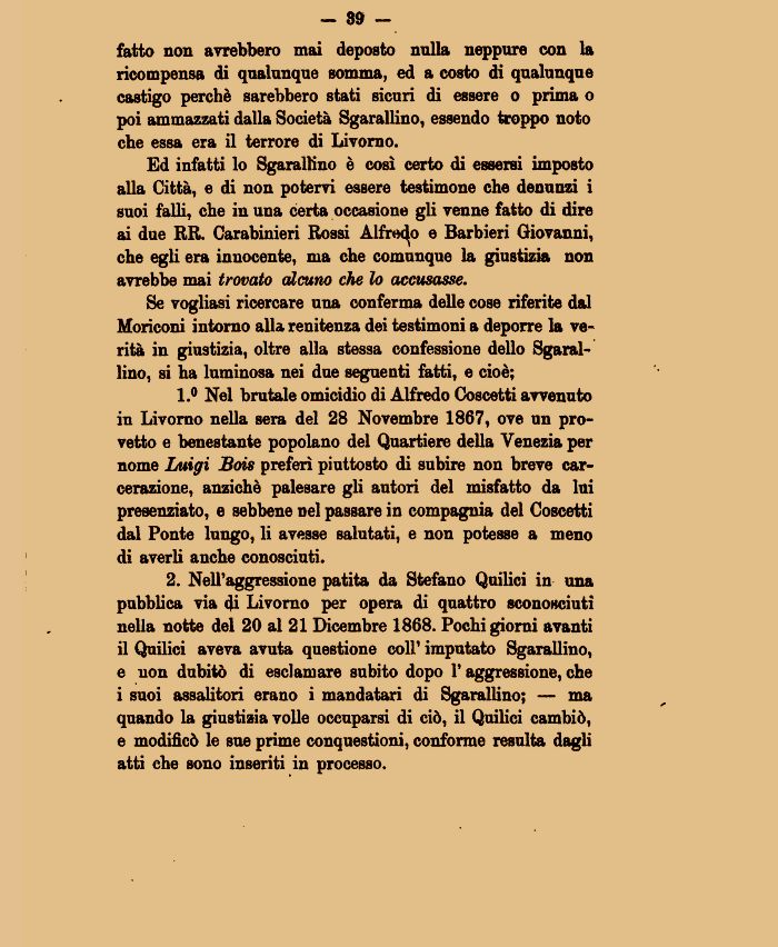 1.° Nel brutale omicidio di Alfredo Coscetti avvenuto in Livorno nella sera del 28 Novembre 1867, ove un provetto e benestante popolano del Quartiere della Venezia per nome Luigi Bois preferì piuttosto di subire non breve carcerazione, anziché palesare gli autori del misfatto da lui presenziato, e sebbene nel passare in compagnia del Coscetti dal Ponte lungo, li avesse salutati, e non potesse a meno di averli anche conosciuti.